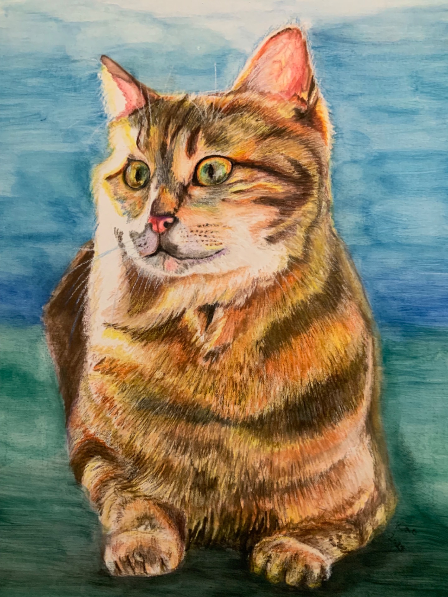 Tohohle kočičáka jsem malovala podle fotky ( doporučení: velmi kvalitní a krásné fotky, které se dají dobře zpracovat do obrázku, bývají v kalendářích - spoustu zvířátek maluji právě z nich. A kalendáře z minulého roku se dají levně sehnat v novoročním výprodeji.), ale promítla jsem do něj hodně z mého miláčka Boníska, kterého znám a mám pod kůží - předloha, podle níž jsem začala malovat, mi Boníska připomněla a tak jsem si výsledný obraz upravila a vnesla do něj Bonískův výraz a některé rysy. Mimochodem, mně se zatím nepodařilo vyfotit Boníska tak, jak bych chtěla, abych si ho namalovala: je strašně těžké stihnout doběhnout pro něco, co fotí a nevyrušit a neprošvihnout požadovanou pozici modelu. Kdo má mazlíčka, ví, že když přijde s mobilem, že si udělá hezkou fotku, mazlíček, co jinak vydrží v té krásné poloze setrvat hodiny, najednou nutně musí odejít, umýt se, najíst…😅 No to jen tak mimochodem - zpět k obrazu.