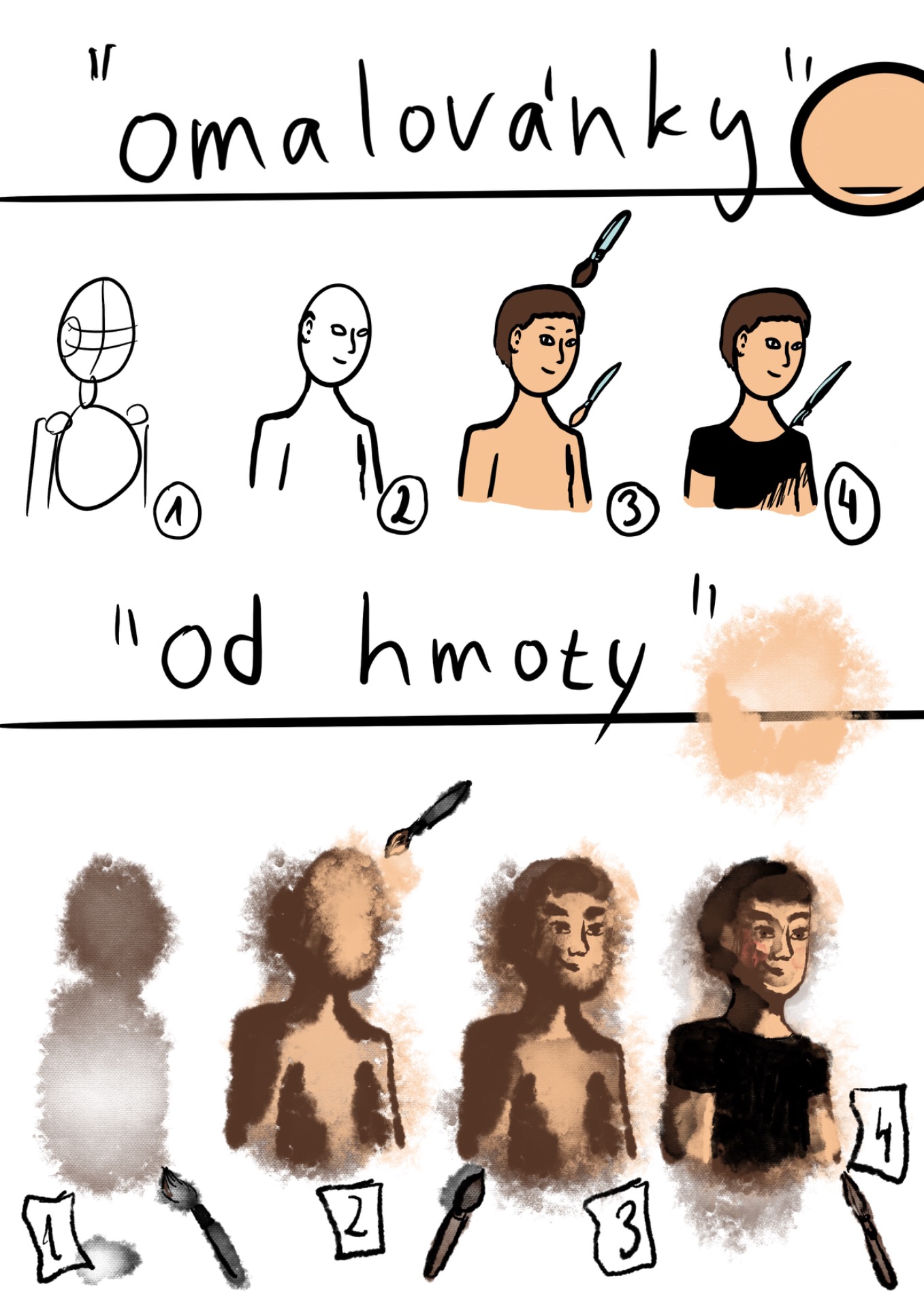 Dnes se pokusím přiblížit vám další postup kreslení na tabletu, který jsem zkoušela. Oproti obvyklému postupu ,, na omalovánky'' jsem tyto postavy kreslila z ploch barvy, z hmoty. Pro lepší představu se podívejte na obrázek: