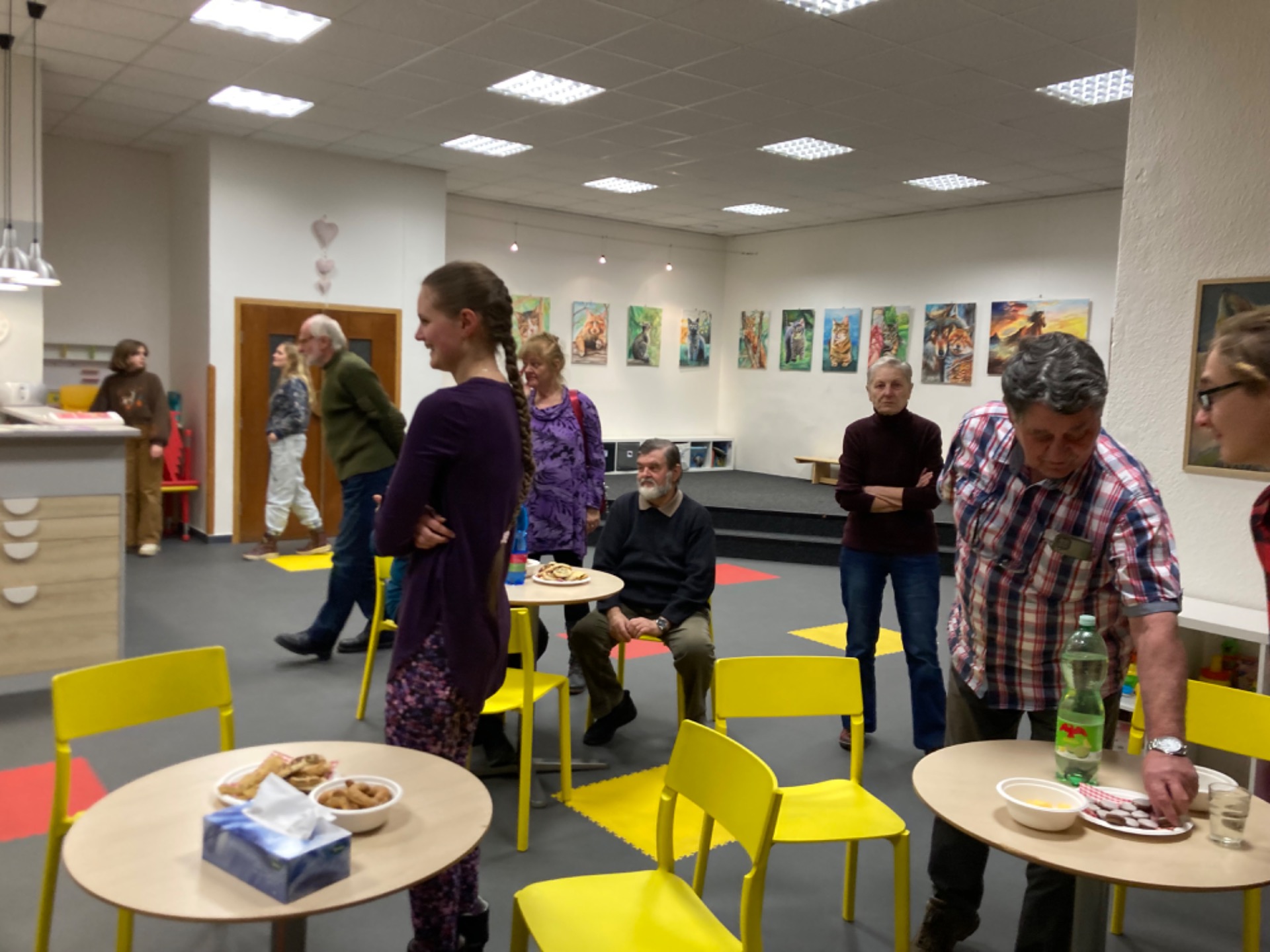 Když ani po pěti minutách po ohlášeném začátku nikdo další nepřišel, pojali jsme to jako komorní besedu. Neskutečně se mi to líbilo, protože paní J., která pořádá kulturní dění, má skvělý přehled v umění a bavit se s ní je báječné. Považuji tu vernisáž za velmi zdařilou, i když je trochu k naštvání, že jsem neměla úvodní projev, protože jsem byla zvědavá na to, jaký bude, když jsem zkoušela vůbec se nepřipravit. No alespoň to bylo v pohodě.😊